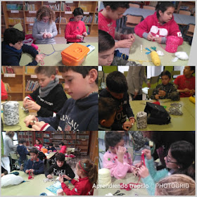 Una mamá de sexto D vino a enseñar a los alumnos de sexto a hacer cositas con trapillo. Gracias Mónica!!